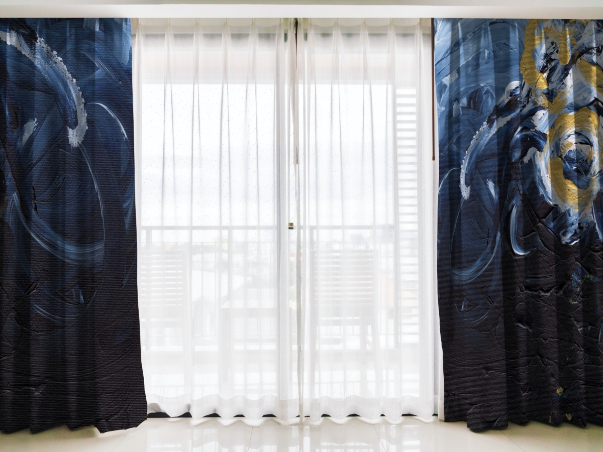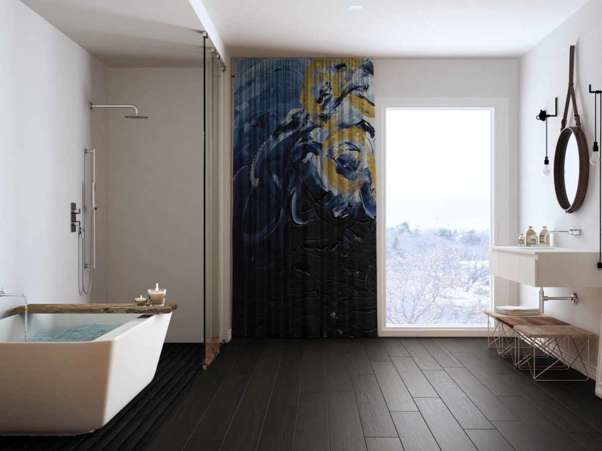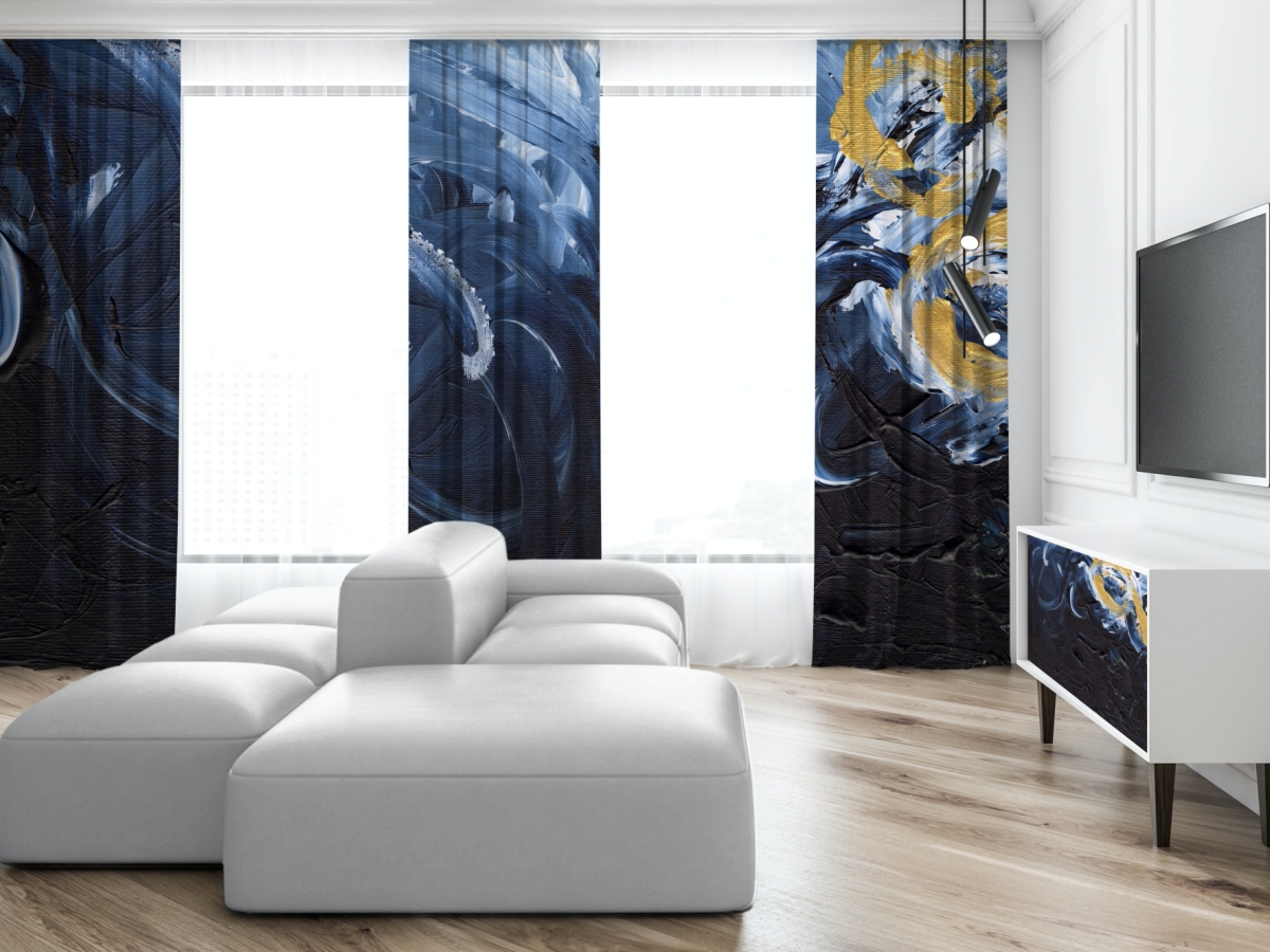 Zasłony są reprodukcją oryginalnych dzieł. Obraz namalowała Monika Piecuch, właścicielka marki Foormat, malarka i projektantka wnętrz, absolwentka ASP w Łodzi.
