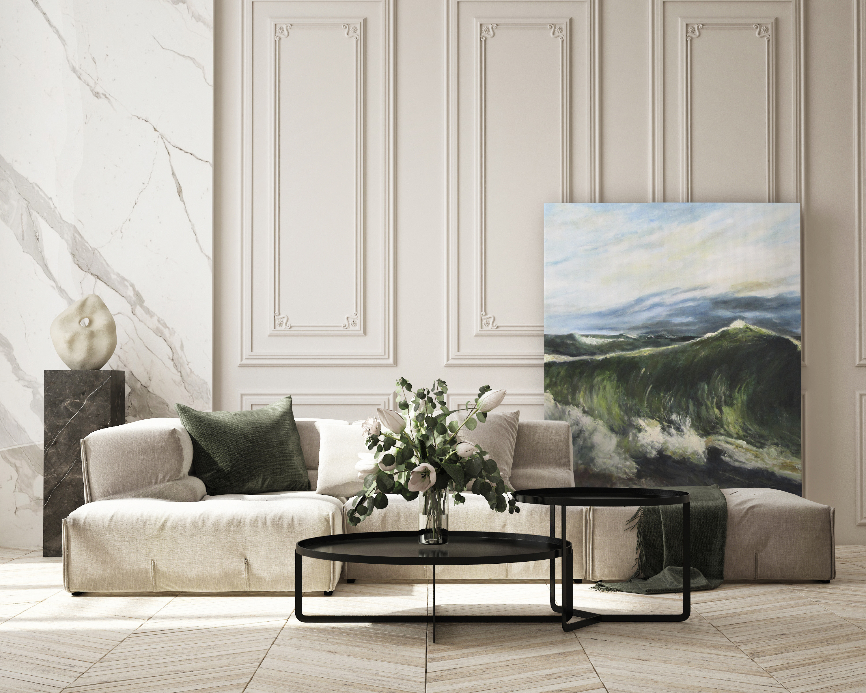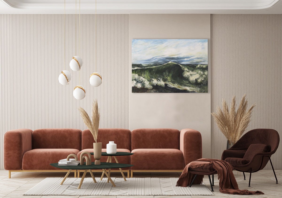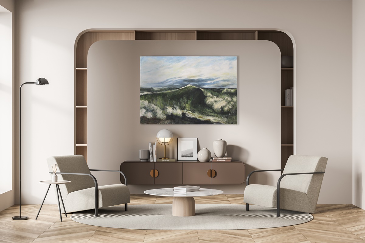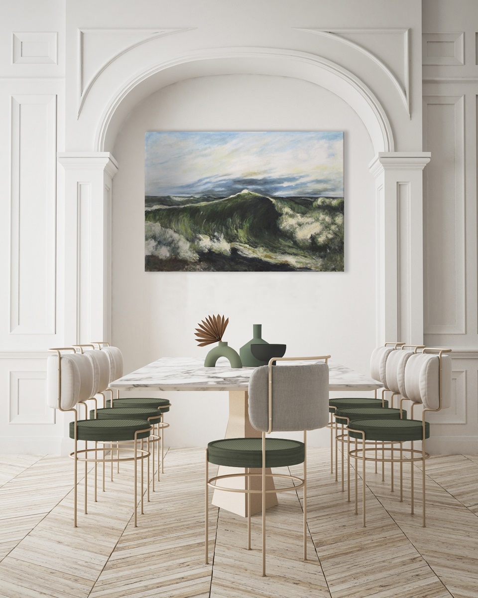 Obraz jest reprodukcją dzieła "La Vague" autorstwa Gustave'a Courtbet'a, namalował go Piotr Kucharski, profesor i wykładowca na ASP w Łodzi.
