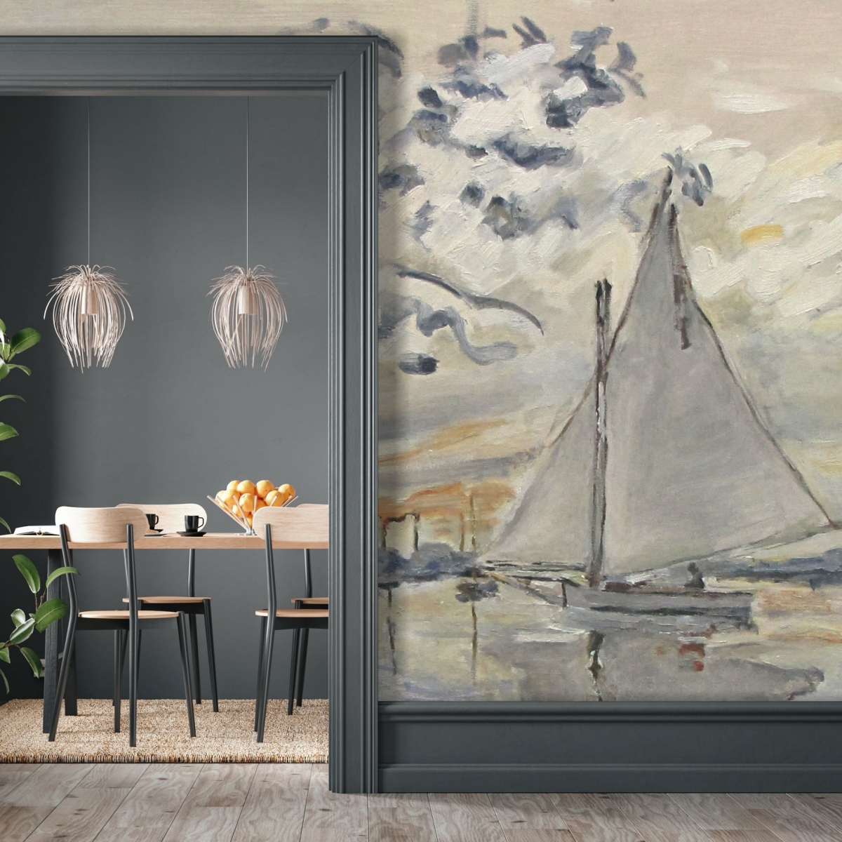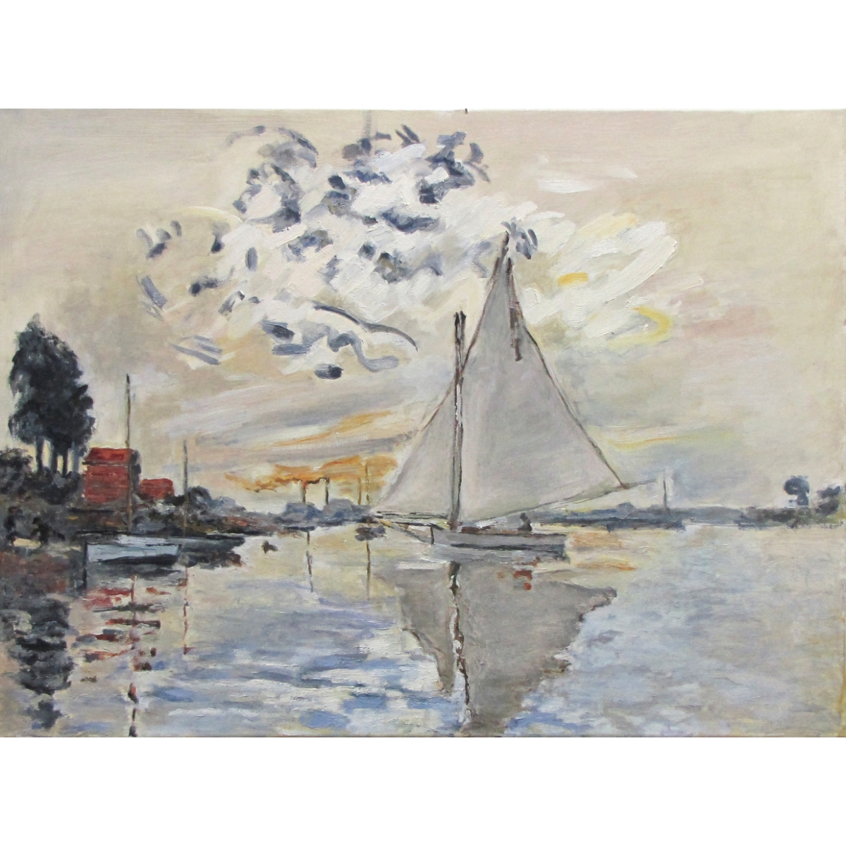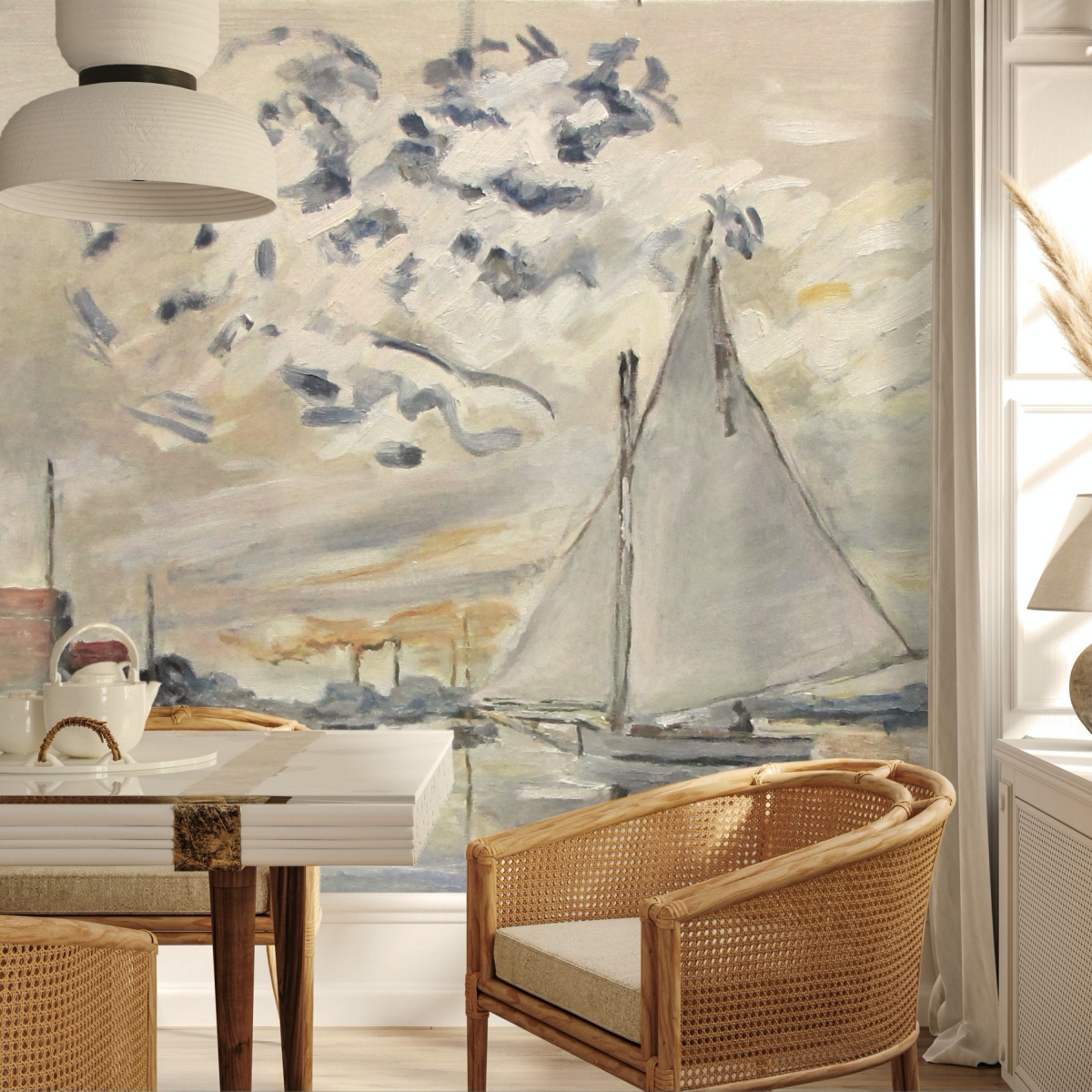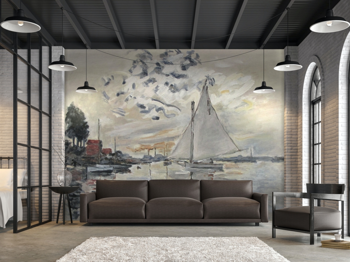 Tapety są reprodukcją oryginalnych obrazów. Obraz jest reprodukcją dzieła "Sailboat at Le Petit-Gennevilliers" autorstwa Claude Monet'a, namalował go Piotr Kucharski, profesor i wykładowca na ASP w Łodzi.
